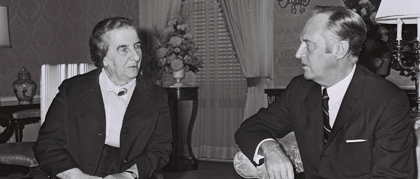 William Rogers amerikai külügyminiszter meglátogatja Golda Meir miniszterelnököt a New York-i Waldorf Astoria szállodában, 1969. szeptember 29-én. Fotó: Moshe Milner/GPO)