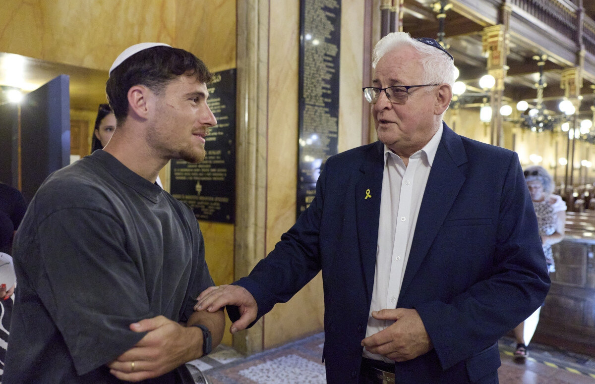 A sikeres labdarúgó tegnap ellátogatott a Dohány utcai zsinagógába, amelyet  héber nyelvű idegenvezetéssel tekintett meg, és közvetlen beszélgetést folytatott dr. Grósz Andorral, a Mazsihisz elnökével először a zsinagógában, majd a Síp utcai székházban.
