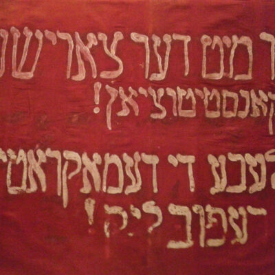 Azt olvassuk a tárgyleírásban, hogy „a pesti zsidó közösség vezetői – kezdeti fenntartásaik ellenére – felismerték az új eszmék társadalmi jelenlétét”. Erre emlékeztet, hogy 1917-ben megvásárolták a lengyel–litván szociáldemokratáknak az 1917-es orosz polgári demokratikus forradalomban lobogtatott zászlaját. Az egyszerű, jiddis szöveggel festett zászló szövege: „Le a cári alkotmánnyal, éljen a demokratikus köztársaság!” – írja a Magyar Zsidó Múzeum és Levéltár heti magazinja.