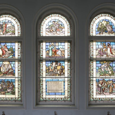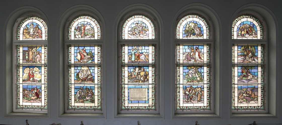 A Magyar Zsidó Múzeum és Levéltár épülete több szimbolikus történeti esemény emlékét hordozza. A második teremben látható díszes ablaksor az 1931-ben átadott épület eredeti berendezéséhez tartozott, és csodával határos módon épségben vészelte át a huszadik századot. Az üvegablakok annak emlékei, hogy a múzeumot a gazdag és befolyásos pesti zsidó hitközségi elit támogatásából, adományaiból hozták létre. Valamennyi ablak a korszak egy-egy tekintélyes családjának emlékét őrzi, amelyek gyakran más pesti jótékonysági intézmények alapítói és donátorai között is feltűnnek.
