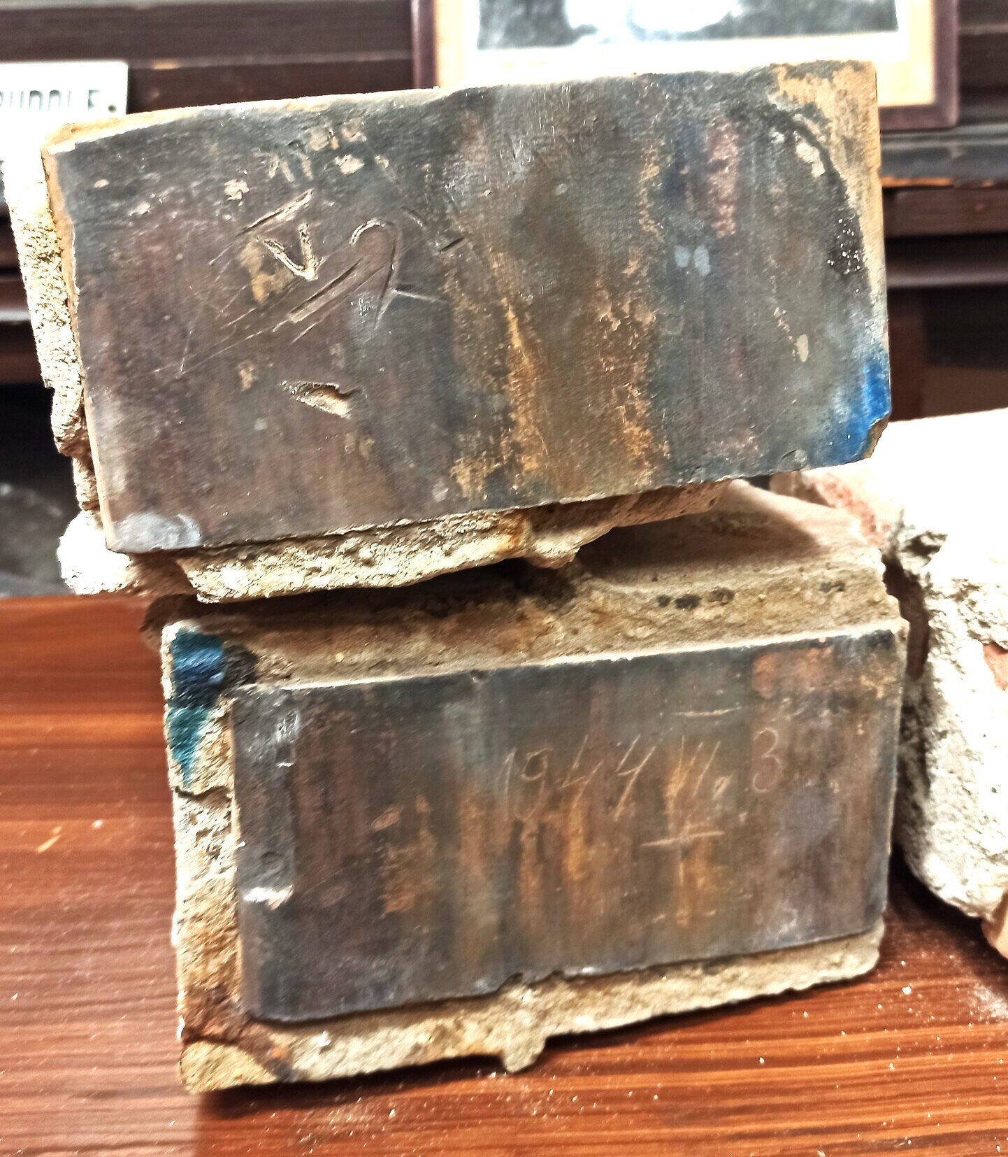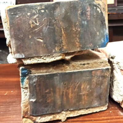 Az itt látható két tégla 2025. márciusában került be múzeumunkba a hitközség székházához tartozó régi kémény bontása során.