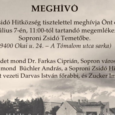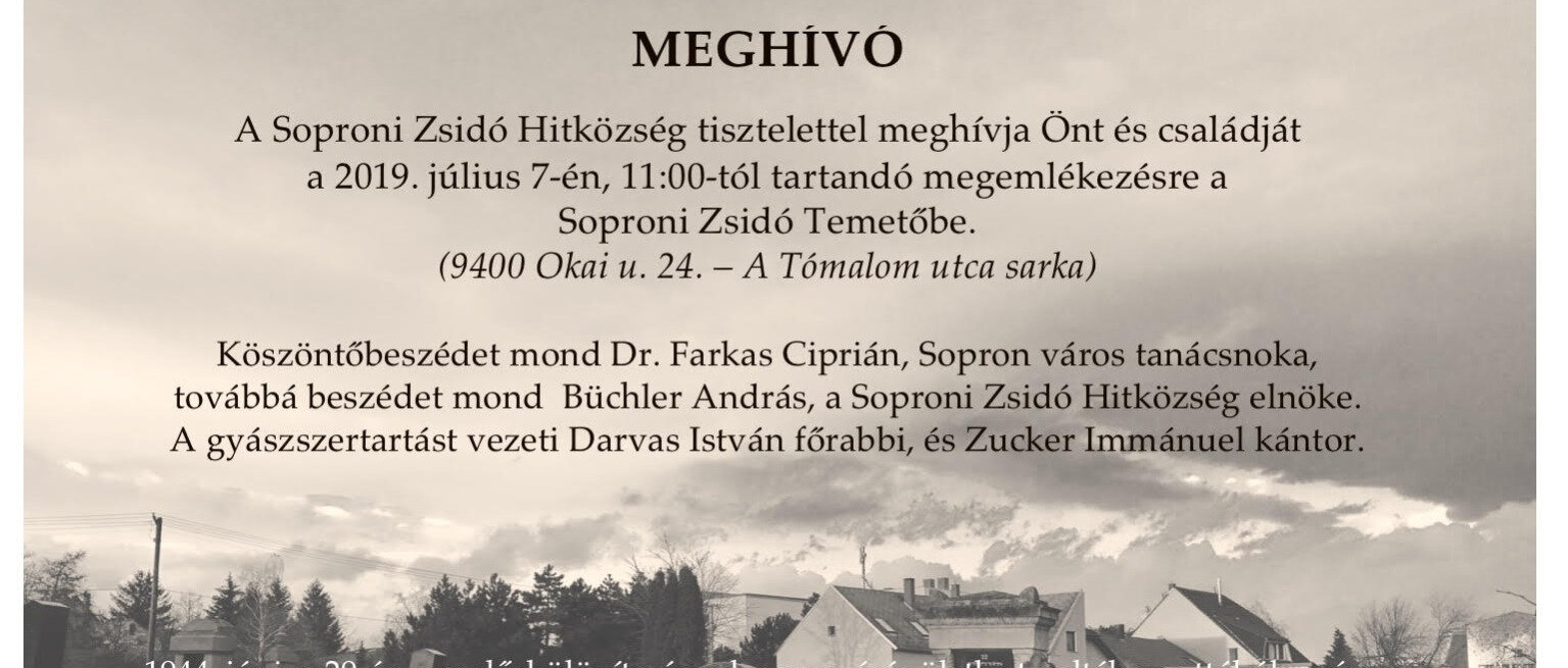 A Soproni Zsidó Hitközség tisztelettel meghívja Önt és családját a 2019. július 7-én, délelőtt 11:00 órától tartandó megemlékezésre a Soproni Zsidó Temetőbe. (9400 Okai u. 24. – A Tómalom utca sarka)