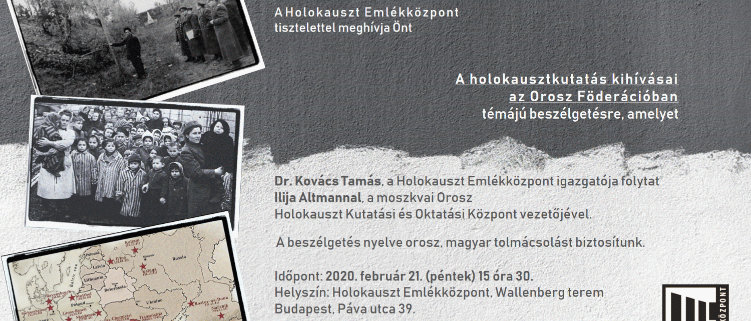 A Holokauszt Emlékközpont tisztelettel meghívja Önt A holokausztkutatás kihívásai az Orosz Föderációban témájú beszélgetésre, 2020. február 21. (péntek) délután fél 4 órára a Holokauszt Emlékközpont Wallenberg termébe (Budapest IX. ker., Páva u. 39.) A beszélgetés nyelve orosz, magyar tolmácsolást biztosítunk.