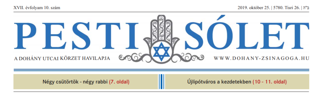 Megjelent a Dohány utcai körzet havilapjának legújabb, XVII. évf. 10. száma, amelyben többek között bemutatkozik a 135 éves Magyar-Zsidó Szemle, tanulmányt olvashatunk Kohn Sámuel főrabbi (1841-1920) tollából a honfoglaló magyarság és a zsidóság kapcsolatáról, továbbá összegzést olvashatnak Zeév Paskesz, Darvas István és Frölich Róbert rabbik tanításaiból.