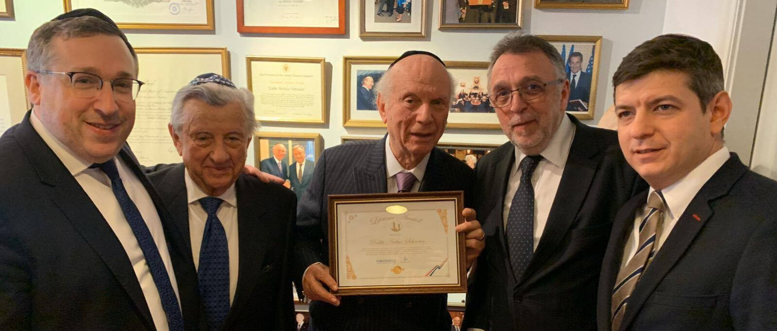 A magyarul is kiválóan beszélő legendás vallási vezetőt egy emlékplakettel köszöntötték fel kilencvenedik születésnapja alkalmából a Magyarországi Zsidó Hitközségek Szövetsége (Mazsihisz) az Egyesült Államokban tartózkodó delegációjának tagjai.