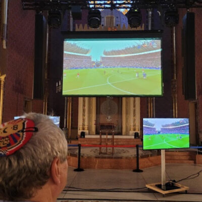 A Rumbach-zsinagógában közösen szurkolhattunk tegnap este a futball EB döntőseinek: a spanyoloknak vagy az angoloknak. A mérkőzés előtt félórával készítettünk  gyorsinterjút a nagy Barça-drukker Róna Ivánnal, a Mazsihisz turisztikai igazgatójával, aki természetesen a jellegzetes Barça-kipáját viselte, s aki természetesen „hazai”, azaz spanyol győzelmet jósolt. Ami be is jött.