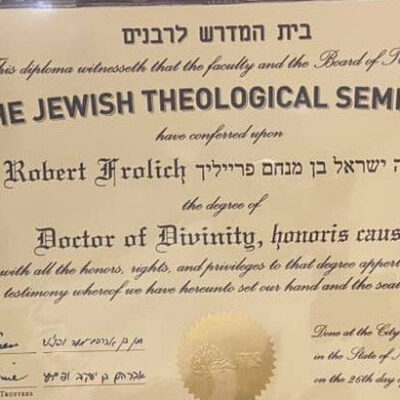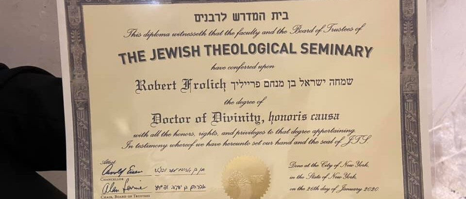 A Rabbitestület nevében gratulációnkat és őszinte örömünket fejezzük ki Dr. Frölich Róbert főrabbi úr felé, kinek munkássága elismerésesképp az Amerikai Egyesült Államok ismert és elismert rabbinikus és zsidó vallástudományok fellegvára, a Jewish Theological Seminary díszdoktori oklevelét vehette át ezen a héten New Yorkban.