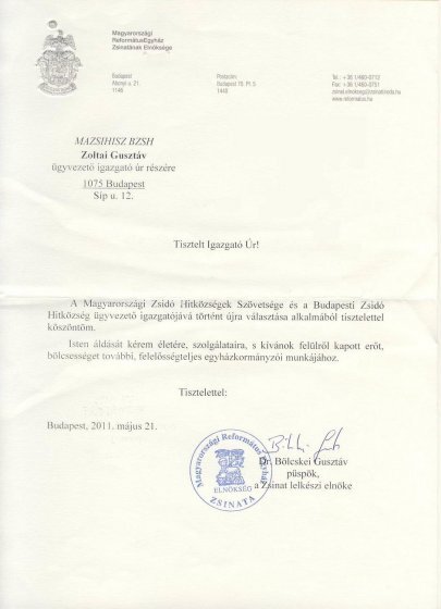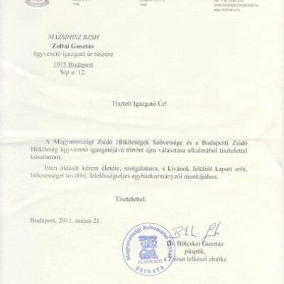 A Magyarországi Zsidó Hitközségek Szövetsége és a Budapesti Zsidó Hitközség ügyvezető igazgatójává történt újra választása alkalmából tisztelettel köszöntöm.