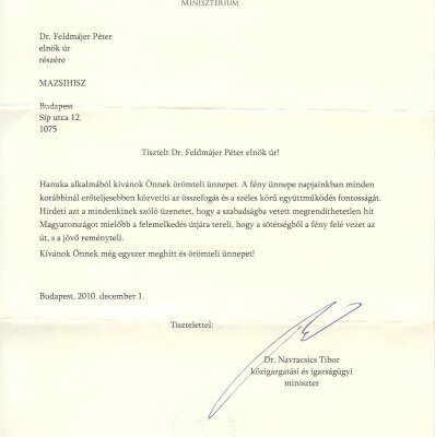 Dr. Navracsics Tibor közigazgatási és igazságügyi miniszter Hanuka alkalmából levélben kívánt örömteli ünnepet.