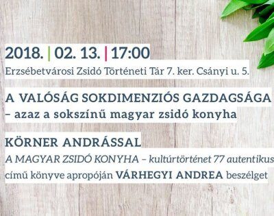 Körner Andrással: A magyar zsidó konyha – kultúrtörténet 77 autentikus recepttel című könyve apropóján, Várhegyi Andrea beszélget, 2018. február 13. (kedden) 17:00 órától az Erzsébetvárosi Zsidó Történeti Tárban (Budapest VII. ker., Csányi u. 5.). Az eseményre minden érdeklődőt szeretettel várnak a szervezők.