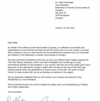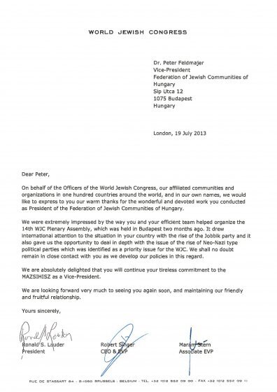 A Zsidó Világ Kongresszus tisztségviselői, a több mint 100 országban hozzánk tartozó közösségek és szervezetek, továbbá saját nevünkben is szeretnék kifejezni legmelegebb köszönetünket azért a csodálatos és odaadó munkáért, melyet Ön a Magyarországi Zsidó Hitközségek Szövetsége elnökeként végzett.