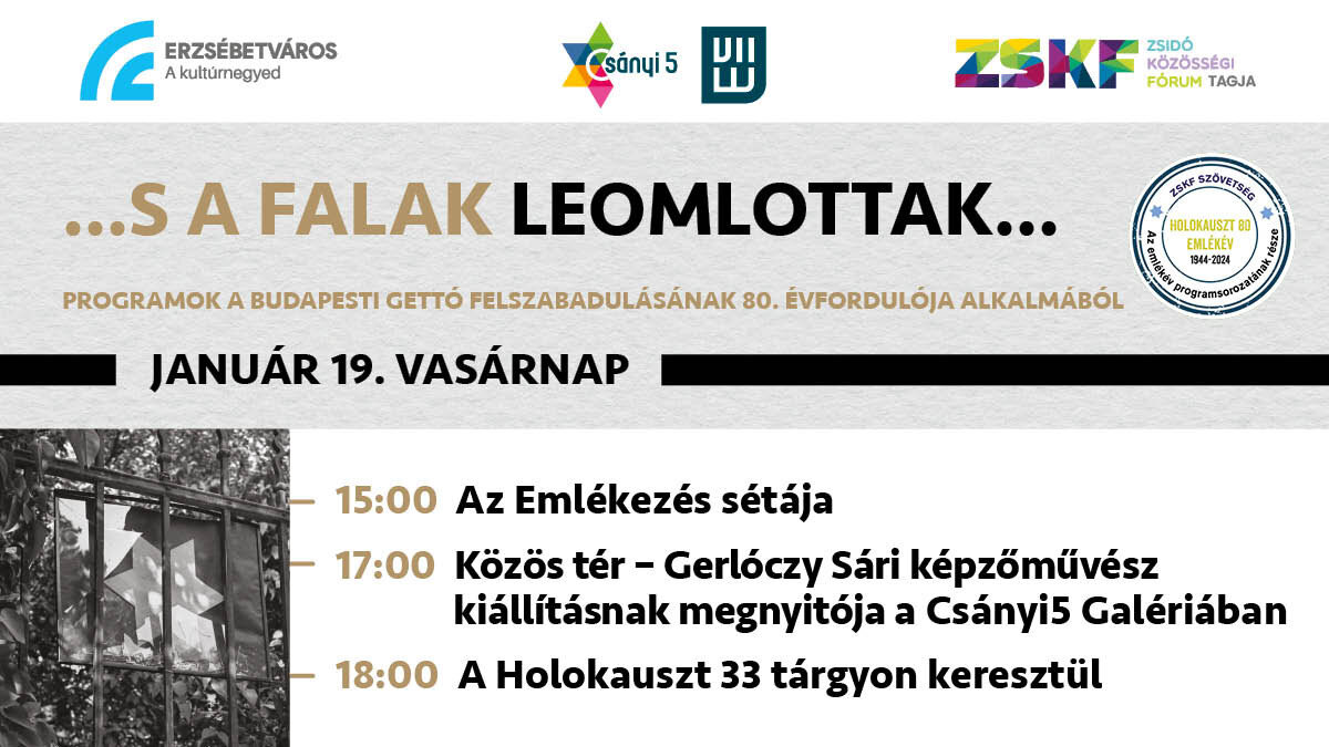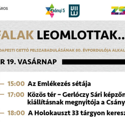 A Holokauszt80 programsorozat zárónapján három rendezvényen vehetnek részt az Erzsébetvárosi Zsidó Történeti Tár (Csányi5) szervezésében január 19-én, e héten vasárnap. Megrendezik az Emlékezés sétáját Karácsony Gergely főpolgármester részvételével; kiállítás nyílik Gerlóczy Sári képzőművész műveiből; és levetítik a Holokauszt 33 tárgyon keresztül című, öt részes filmsorozat utolsó epizódját.