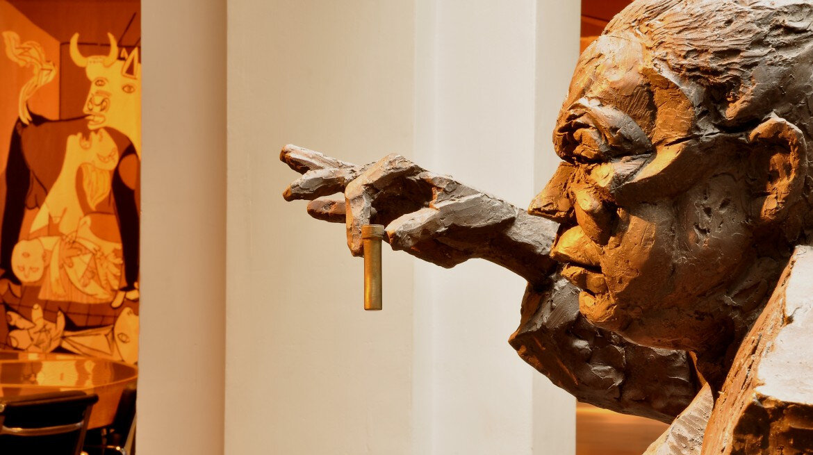 Igen izgalmas volt előadásában az világi hatalom emberének és a kép földöntúli hatalmának összevetését hallani Colin Powell amerikai külügyminiszter és Picasso Guernicája kapcsán. Mint felidézte: 2003-ban, amikor Powell az ENSZ Biztonsági Tanácsa előtt bejelentette Irak megtámadásának casus bellijét, akkor a háttérben ott volt a háborúellenes Guernica faliszőnyeg-másolata is, méghozzá kék vászonnal lefedve. Habár a festmény elfüggönyözését forgatástechnikai okokkkal magyarázták, a háború ellen született mű és a háborút megelőlegező külügyminiszteri beszéd között érezhető volt a feszültség. Nem véletlen, hogy a Hatalom és a Kép találkozása megihlette a képzőművészeket, és installáció is készült az esetből. Ehhez kapcsolódva címlapképünkön Goshka Macuga: A szörny természete című alkotása látható a White Chapel Galleryből.