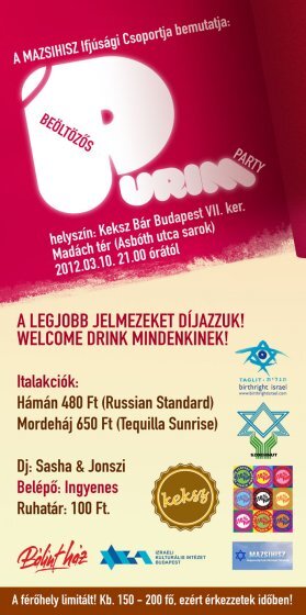 A Mazsihisz ifjúsági csoportja szervezésében, 2012. március 10. szombat, este 9 órától a Keksz Bárban, Budapest VII. ker., Madách tér (Asbóth u. sarok). A legjobb jelmezeket a szervezők díjazzák.