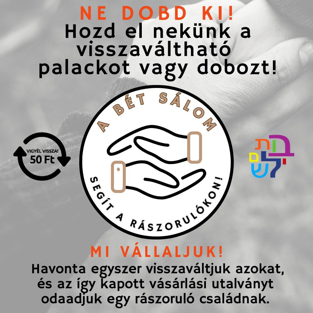 Mint a Facebook-bejegyzésében olvasható: „a Bét Sálom Zsinagóga vezetősége vállalja, hogy a zsinagógába behozott, betétdíjas műanyag palackokat vagy fémdobozokat havonta egyszer visszavisszük és az érte kapott vásárlási utalványt egy rászoruló családnak adjuk oda”.