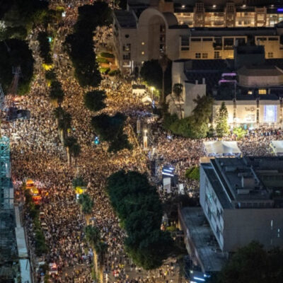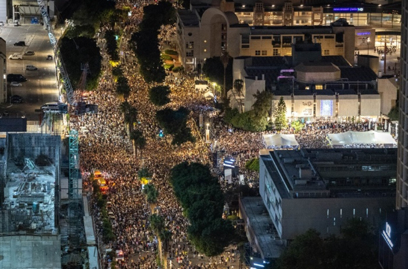 A szervezők becslése szerint négyszázezren gyűltek össze Tel-Aviv egyik központi terén, amelyet az utóbbi két évben átneveztek a Túszok terének, mivel a 2023. október 7-én a Gázai övezetbe hurcolt izraeliek hazahozatalát itt követelték a túszok hozzátartozói és támogatóik.