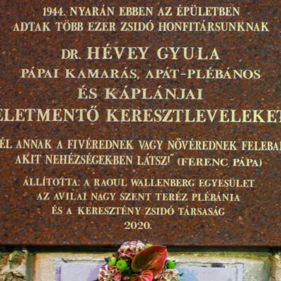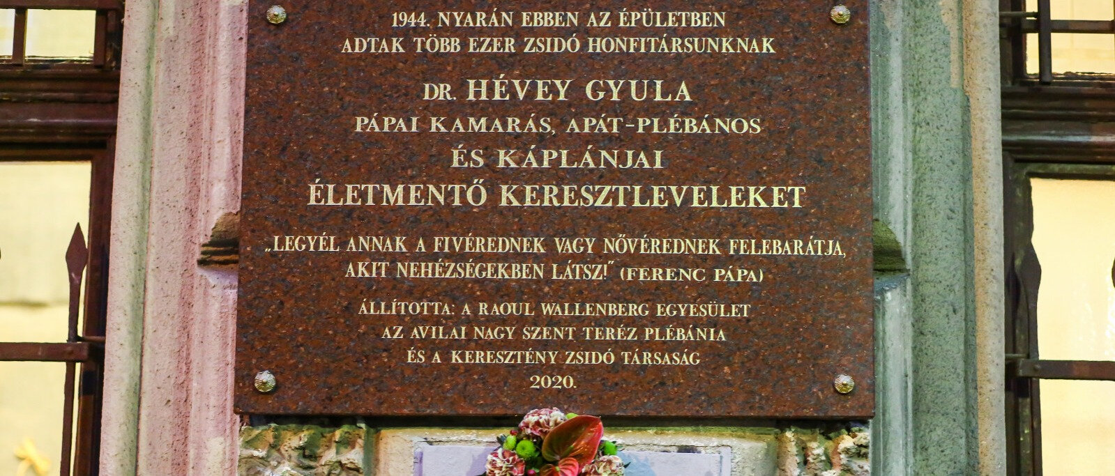 Emléktáblát avattak Hévey Gyula terézvárosi plébánosnak, aki 1938 és 1944 között több ezer keresztlevelet állított ki, hogy megmentse zsidó honfitársait. A terézvárosi plébánia falán elhelyezett emléktáblát Erdő Péter bíboros, esztergom-budapesti érsek áldotta meg, 2020. október 15-én, csütörtökön.