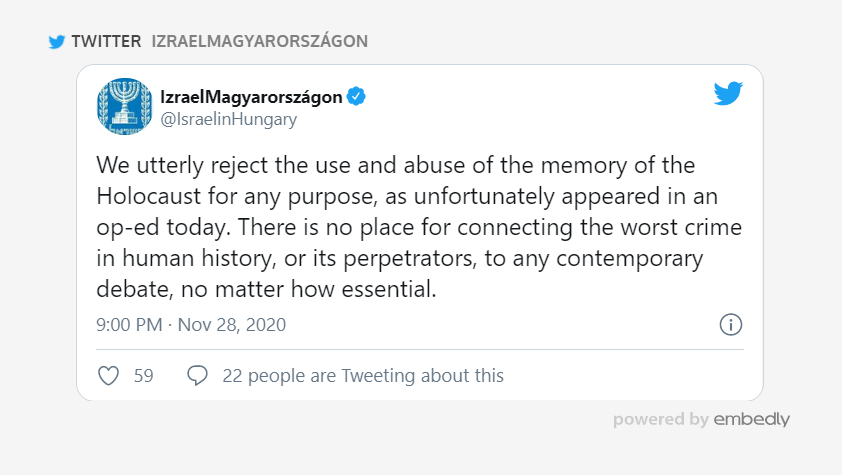 Magyarul: „Teljesen elutasítjuk a holokauszt emlékének bármilyen célú felhasználását és az azzal való visszaélést, amint az sajnálatos módon egy mai véleménycikkben megtörtént. Az emberiség történelmének legsúlyosabb bűncselekményét vagy annak elkövetőit nem lehet összekapcsolni semmilyen mostani vitával, függetlenül attól, hogy az mennyire lényeges”.
