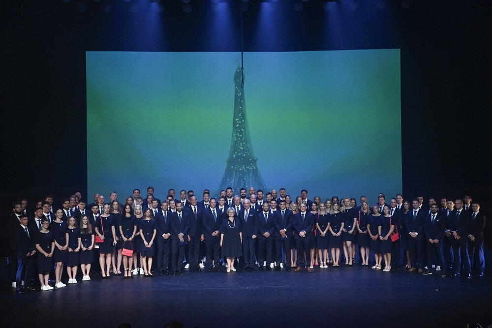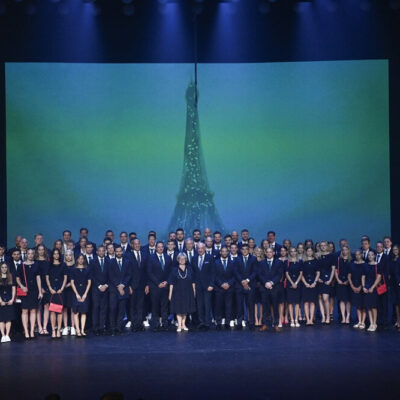 Fotó: A párizsi ötkarikás játékokon szereplő magyar csapat csoportképe a Művészetek Palotájában tartott eskütételen július 8-án. Elöl középen Sulyok Tamás köztársasági elnök, mellette balról felesége, Nagy Zsuzsanna. Kép: MTI/Kovács Tamás. (A fotón Fábián Sára Ráhel jobbról a negyedik versenyző.)
