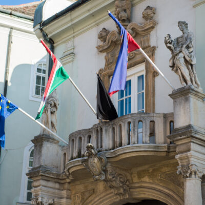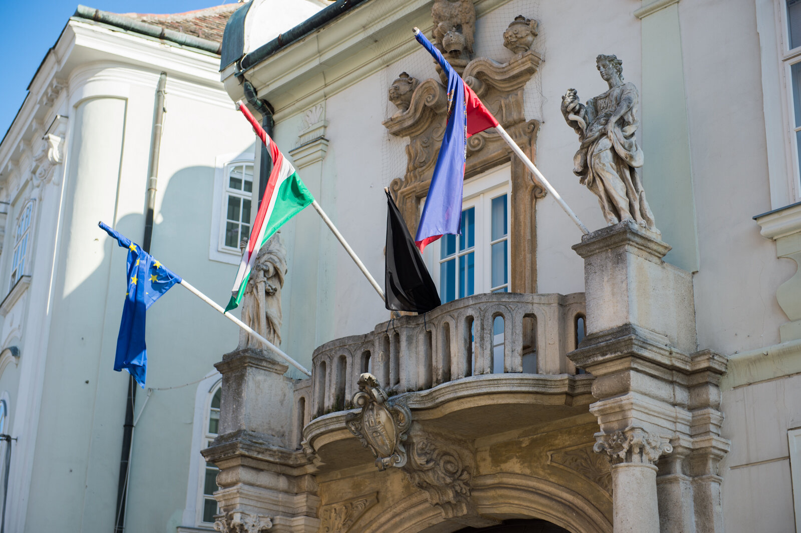 Fekete zászló a székesfehérvári városházán az áldozatok emlékére