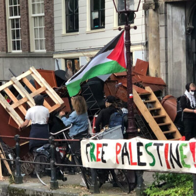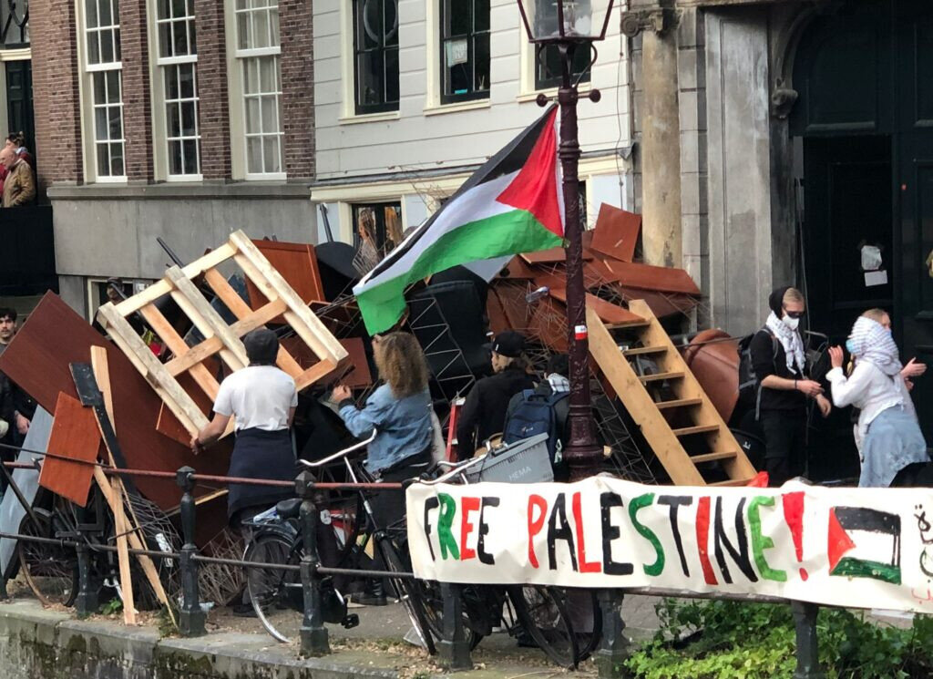 Fotó: Palesztinpárti barikádharcosok egy holland egyetemen (Forrás: Wikimedia commons)