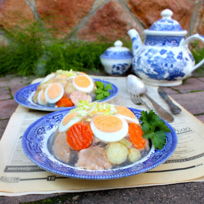 • Két tálkát kibélelek folpackkal, és elrendezem benne a keménytojást, lazacpogácsát, répát, végül ráöntöm a meleg levet.