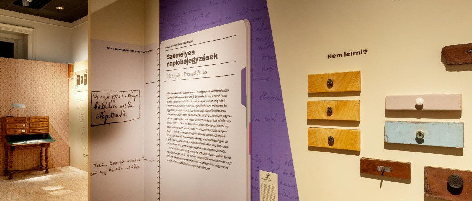A látogatók olyan szerzők kézirataival találkozhatnak, mint Csáth Géza, Móricz Zsigmond, Szentkuthy Miklós, Lesznai Anna vagy Füst Milán, aki zsidó származásúként különösen mélyen élte meg a kívülállóság tapasztalatát, s naplóit élete fő művének tartotta. Móricz írásaiban több helyütt jelennek meg zsidó szereplők, társadalmi viszonyrendszerek árnyalt vagy sztereotip ábrázolásával. A tárlat azt is bemutatja, hogyan válnak a személyes feljegyzések irodalmi és történelmi értékű dokumentumokká.
