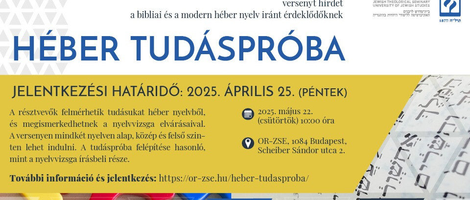 Az Országos Rabbiképző – Zsidó Egyetem Idegen Nyelvi Lektorátusa versenyt hirdet a bibliai és a modern héber nyelv iránt érdeklődőknek. A résztvevők felmérhetik tudásukat héber nyelvből és megismerkedhetnek a nyelvvizsga elvárásaival.