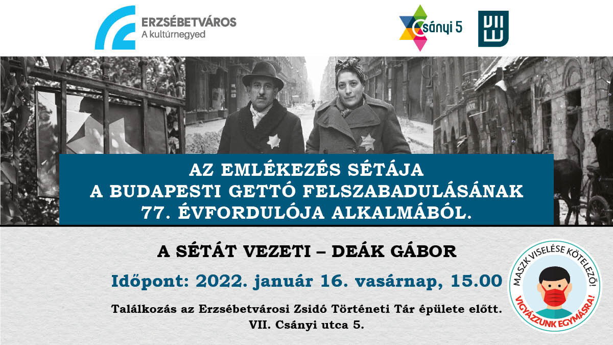 A budapesti gettó felszabadulásának 77. évfordulója alkalmából rendezik meg Az emlékezés sétája elnevezésű megemlékezést január 16-án, jövő héten vasárnap délután 3 órától. A rendezvényt az Erzsébetvárosi Zsidó Történeti Tár szervezi a Magyar Zsidó Kulturális Egyesület (Mazsike) közreműködésével, a sétát ezúttal Deák Gábor vezeti.