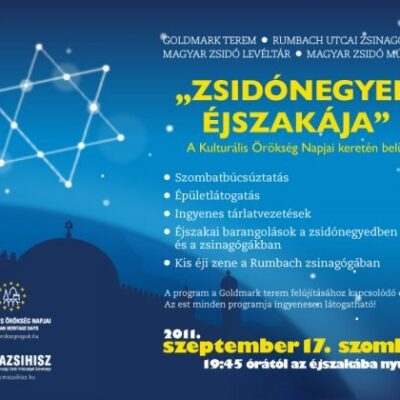 mazsihisz_zsidonegyed_ejszkaja_2011_facebook_200x600.jpgSzombatbúcsúztatással, azaz „Mindenki havdoló-jával” kezdődik a színes programsorozat a Goldmark Teremben, Frölich Róbert a Dohány utcai zsinagóga főrabbija közreműködésével. A Magyar Zsidó Múzeumban Verő Tamás rabbi vezeti be a zsidó vallás rejtelmeibe az érdeklődőket, és igyekszik mindenki kérdésére teljes körűen válaszolni, ráadásul még kvízkérdésekre is felelhetnek a vállalkozó kedvűek, értékes nyereményekért. A zsidó levéltárban megcsodálhatják a résztvevők Goldziher Ignác híres orientalista tudós aláírását, valamint egy csaknem nyolcszáz éves illusztrált pergament. A táncos lábúak pedig a Kis éji zene program részeként, este 9 órától a Söndörgő és a „Tzomet zenekarok koncertjeire rophatják hajnalig az Otto Wagner bécsi építész tervei alapján 1868 és 1872 között mór stílusúban épített Rumbach Sebestyén utcai zsinagóga falai között.