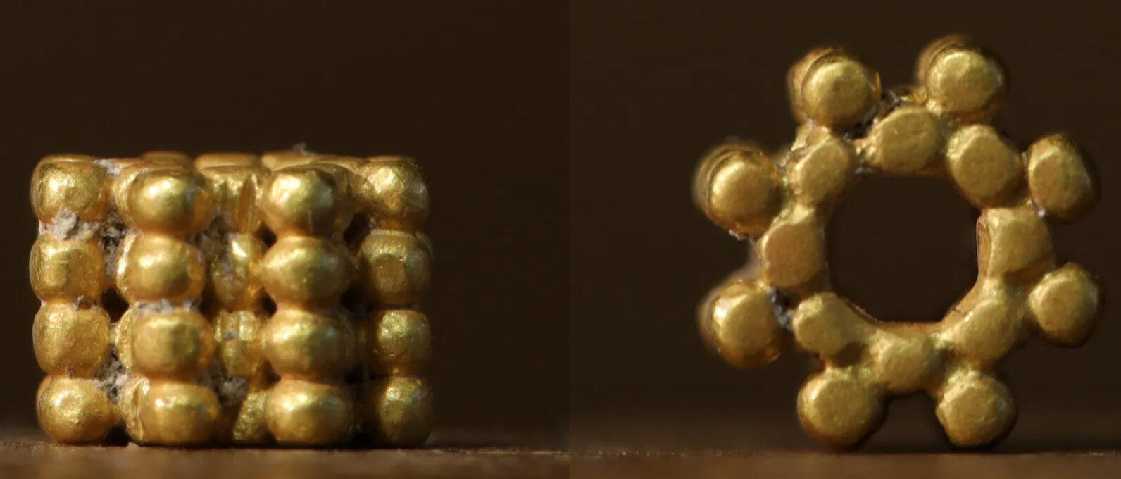 Az aranyból készített kicsiny gyöngy annyira ép állapotban vészelte át az évezredeket, hogy amikor a kisfiú megmutatta a felügyelő régésznek, eleinte azt hitte, mai tárgyra bukkantak. A gyöngy négy rétegben egymáshoz illesztett kicsi, virágalakú aranylapokból áll.