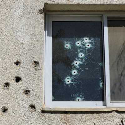 Fotó: a beeri kibuc egyik épületének megsorozott fala. (Mazsihisz-fotó)