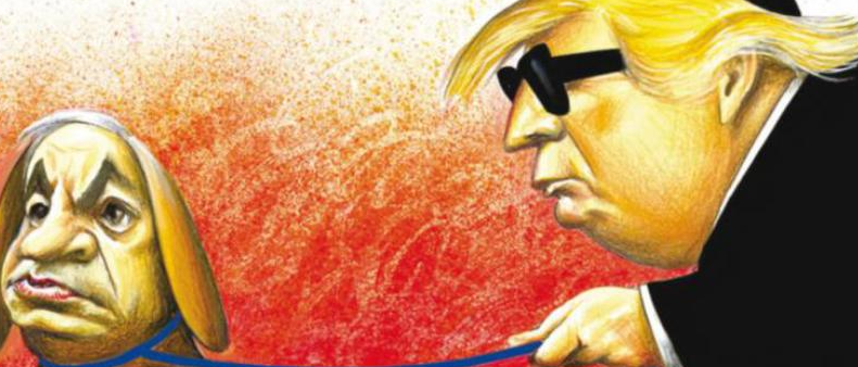 A karikatúra a múlt héten jelent meg a lap nemzetközi kiadásában, és Benjamin Netanjahu izraeli kormányfőt ábrázolta, amint Dávid-csillaggal – mintegy vakvezető kutyaként – vezeti a fekete szemüveges és kipát viselő Donald Trump amerikai elnököt.