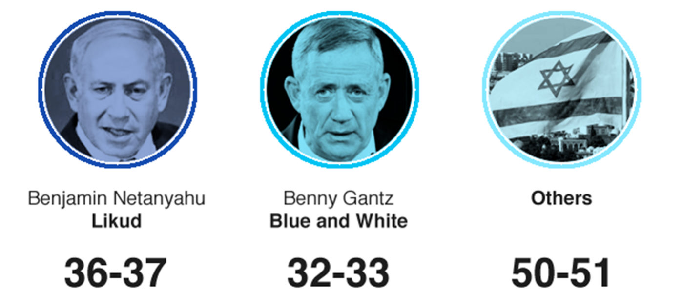 A Likud 37 mandátumot szerzett a százhúsz tagú izraeli parlamentben, a kneszetben két televízió exit pollja szerint is. Őket követi az ellenzéki centrista Kék-fehér párt 32, illetve 33 parlamenti hellyel. A jobboldali -vallásos tömb azonban egyik televízió szerint sem szerzett többséget ezúttal sem a kneszetben, hanem hatvan mandátummal rendelkezik, s vele szemben szintén hatvan helye lett együtt a Kék-fehér pártnak, a baloldali Egyesült Pártnak, az Arab Egyesült Listának és Avigdor Liberman jobboldali nacionalista, Izrael a Hazánk nevű pártjának. A kormányalakításhoz 61 mandátumra van szükség.