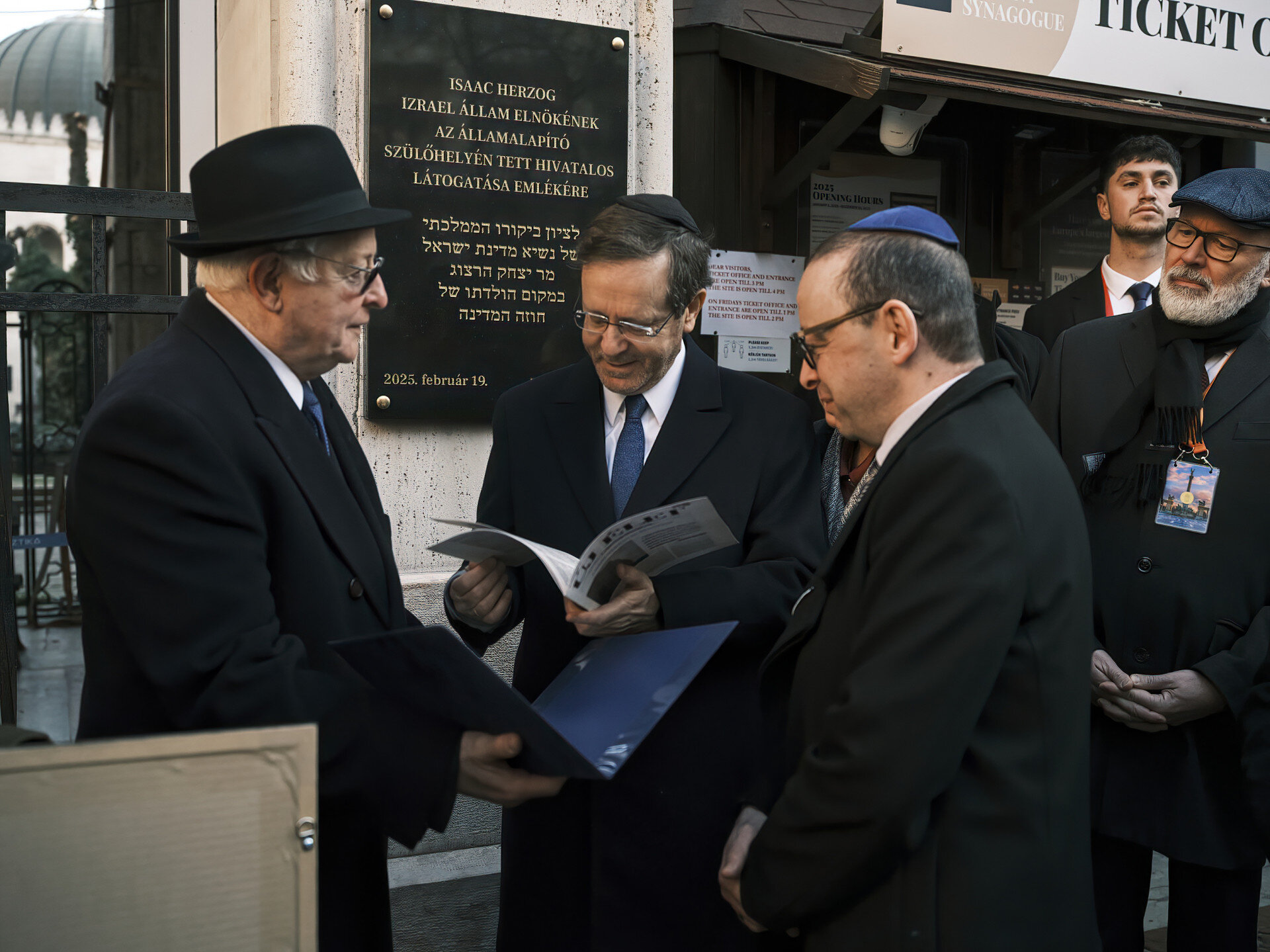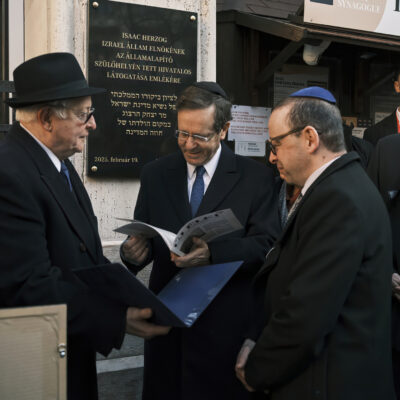A Zsidó Állam elnöke, Jichák Herzog ma reggel ellátogatott a Herzl térre, Herzl Tivadar egykori szülőházának helyére, és megtekintette a Dohány utcai zsinagógát, amelynek falán 1991-ben az édesapja, Chájim Herzog, Izrael hatodik elnöke helyezett el emléktáblát. Most az államfő a Mazsihisz elnökével, dr. Grósz Andorral leplezte le azt a márványtáblát, amely viszont az ő látogatásának állít emléket.