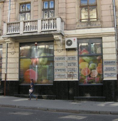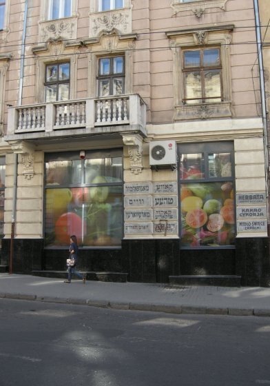 És a lwówi (Lemberg) boltok feliratai. Talán Lwów az egyetlen város Európában, ahol máig látni még jiddis nyelvű feliratokat az utcán. És nemcsak hogy fennmaradtak hetven éven át, míg a város Csipkerózsika-álmát aludta, de manapság, az üzletek felújításakor meg is őrzik őket a boltok díszvakolatának kváderein.