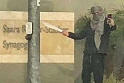 A fején kuffiját, vagyis hagyományos arab kendőt viselt az a férfi, aki a napokban a Chabad mozgalom egyik Los Angeles-i zsinagógája előtt pózolt. Az egyik kezében macsétát fogott, miközben a másik kezében lévő okostelefonnal fotózta saját magát. A bozótvágó kést úgy tartotta, hogy a penge a zsinagóga feliratra essen.