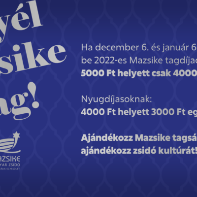 Aki az egyesületi tagdíját január 6-ig befizeti a 2022-es évre, az kedvezményt kap a Magyar Zsidó Kulturális Egyesület (Mazsike) éves tagdíjából. Fontos: a nyugdíjasok számára ez azt jelenti, hogy ha élnek az akció által nyújtott kedvezménnyel, akkor nekik egy évre csak 3 ezer forintot kell fizetniük.