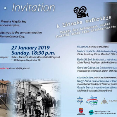 Szeretettel meghívjuk Az Élet Menete Alapítvány ENSZ holokauszt emléknapi rendezvényére, 2019. január 27. (vasárnap), 18.30 órára a RaM – Radnóti Miklós Művelődési Központba (Budapest XIII. ker., Kárpát u. 23.)