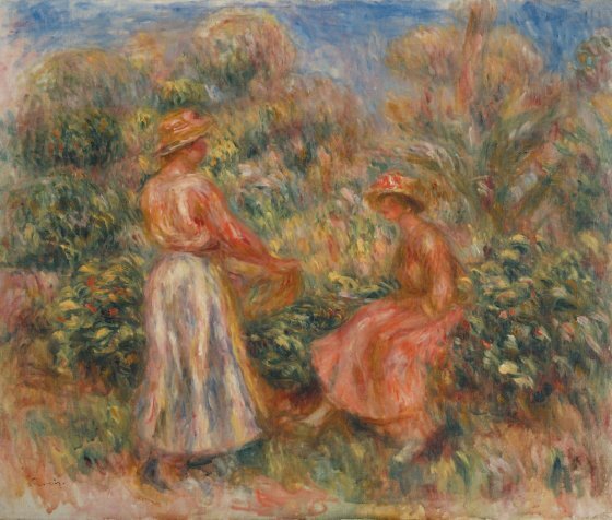 A Két nő egy kertben című alkotást Pierre-Auguste Renoir 1919-ben, halála évében festette, a kis méretű kép egyike volt utolsó munkáinak. (MTI)