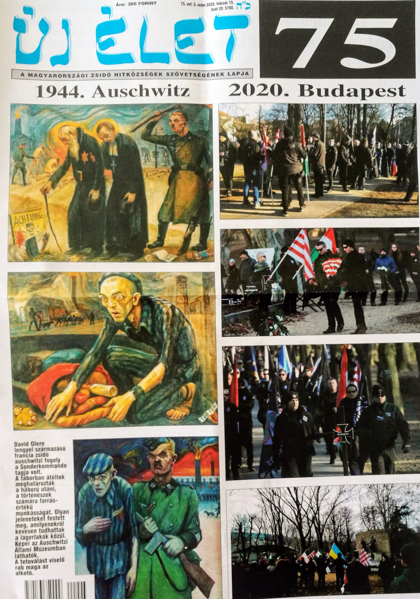 Már a standokon a Magyarországi Zsidó Hitközségek Szövetsége (Mazsihisz) lapjának, az Új Életnek a 75. évf. 3. száma. Különös figyelmükbe ajánljuk a címlapot, amely az auschwitzi rettenetet átélő és megfestő David Olere képeit állítja szembe a Városmajorban csaknem két hete felvonult neonácikról készült fotókkal.
