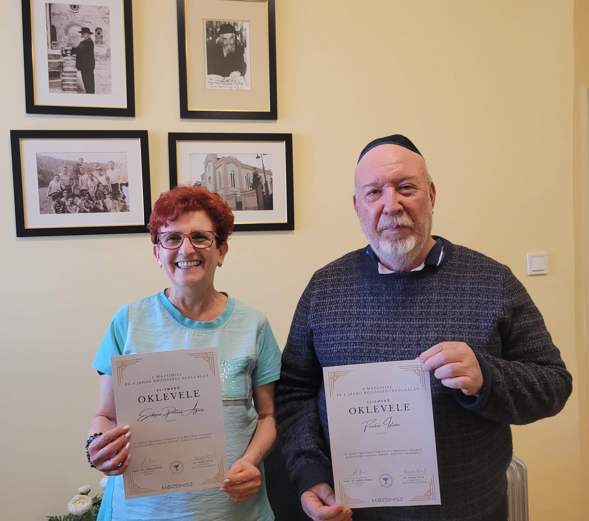 Címlapkép: Erdősné Pollák Ágnes és Flecker István a Mazsihisz Együtt-Egymásért Programjának elismerő oklevelével, amelyet Kósa Judit és Fejes Emőke adott át