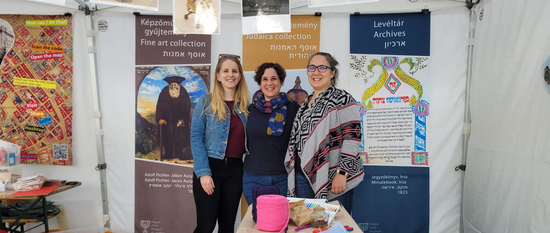 A Múzeumok Majálisa elnevezésű, múlt hétvégén megrendezett rendezvény-sorozaton a Magyar Zsidó Múzeum és Levéltár csapata is képviseltette magát a Magyar Nemzeti Múzeum kertjében. Sokan érdeklődtek a zsidó vallás, hagyományok, ünnepek és kultúra iránt, szóval a múzeum munkatársainak, Dancz Verának, Farkas Zsófiának és Mezei Hannának nem kevés dolga akadt. De a mosolyukból ítélve legalább nagyon élvezték – akárcsak a látogatók.