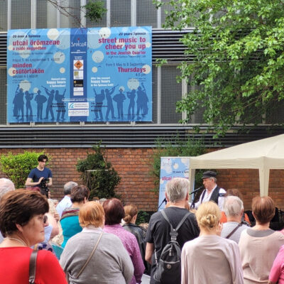 A budapesti Dob utca és Rumbach Sebestyén utca sarkán ma délután 4-től több száz fős tömeg gyűlt össze, hogy meghallgassa a Spinoza Ház, az erzsébetvárosi önkormányzat és a Mazsihisz által szervezett első Utcai Örömzene elnevezésű koncertet. Írják föl a naptárba, hogy ott mostantól a nyáron minden csütörtökön délután 4-től ez lesz: zene, zene, zene! De csakis magas színvonalon.