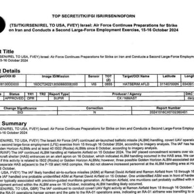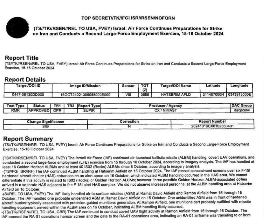 Az USA által Iránnak kiszivárogtatott, műholdas és egyéb módokon megszerzett információból összerakott hírszerzési dokumentumokból óriási botrány van, amerikai vizsgálattal, mindennel. Az információ Izrael Irán elleni válaszcsapásának a részleteire, módszerére és időzítésére vonatkozik.