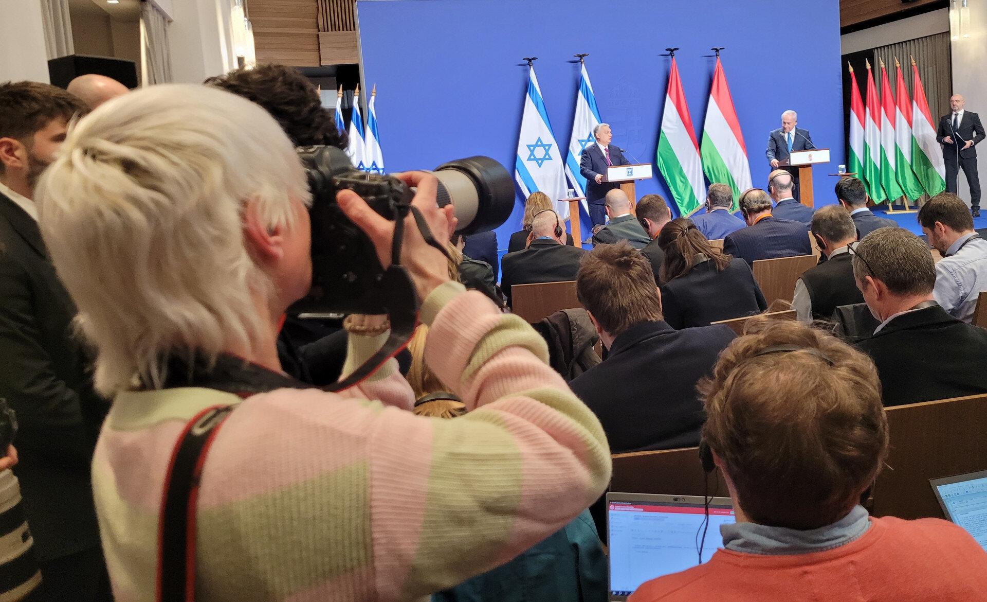 A magyar média és a világsajtó munkatársai zsúfolásig megtöltötték a Karmelita sajtótermét, hogy meghallgassák a két kormányfő tájékoztatását, majd kérdéseket tegyenek föl nekik – ez utóbbi azonban elmaradt. Orbán Viktor és Benjámin Netanjahu rendkívül udvarias beszédben méltatták a két ország kapcsolatát, majd miután mindketten elmondták mondanivalójukat, kisétáltak a teremből, ami a jelenlévő újságírókat láthatóan meglepte.