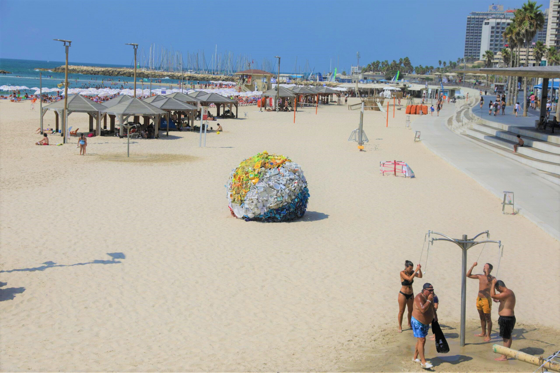 A tel-avivi városvezetés adatai szerint szerint évente 20 millió tonna hulladék kerül a vizekbe, sőt, a Földközi-tengert percenként (! ) 34 ezer darab műanyag palack szennyezi be. Többk között e riasztó adatok késztették arra Tel-Aviv vezetését, hogy Tal Tenne Czaczkes izraeli művésznő meghökkentő alkotásával hívják fel a strandolók figyelmét a környezet épségének megóvására és a természetkárosítás veszélyeire.