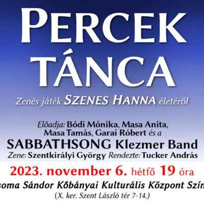 Az Izrael melletti szolidaritásuk kifejezéseképpen a Sabbathsong Klezmer Band tagjai a terror áldozatainak megsegítésére ajánlják fel a Percek tánca című, november 6-i előadásuk bevételét. A zenés játék a X. kerületi Kőrösi Csoma Sándor Kőbányai Kulturális Központban lesz jövő héten hétfőn este 7 órától. Köszönet és elismerés a Sabbathsong Klezmer Band zenekar összes tagjának!