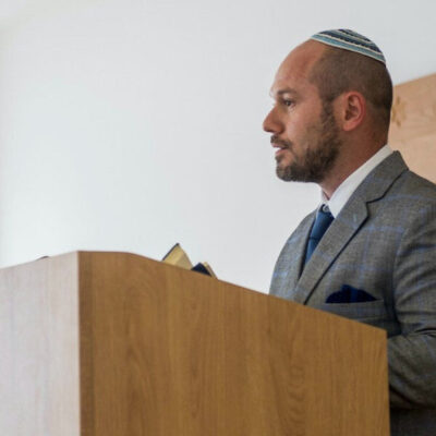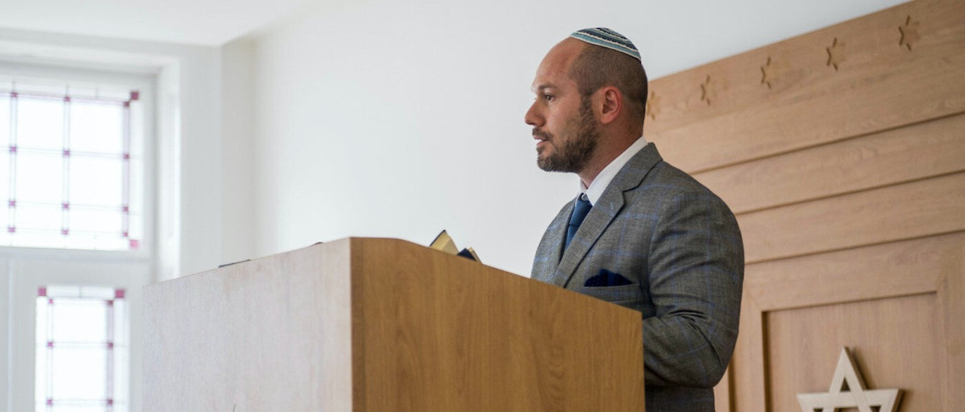 Tamás, a Mazsihisz Rabbitestületének elnöke beszédet mond a kecskeméti zsidó