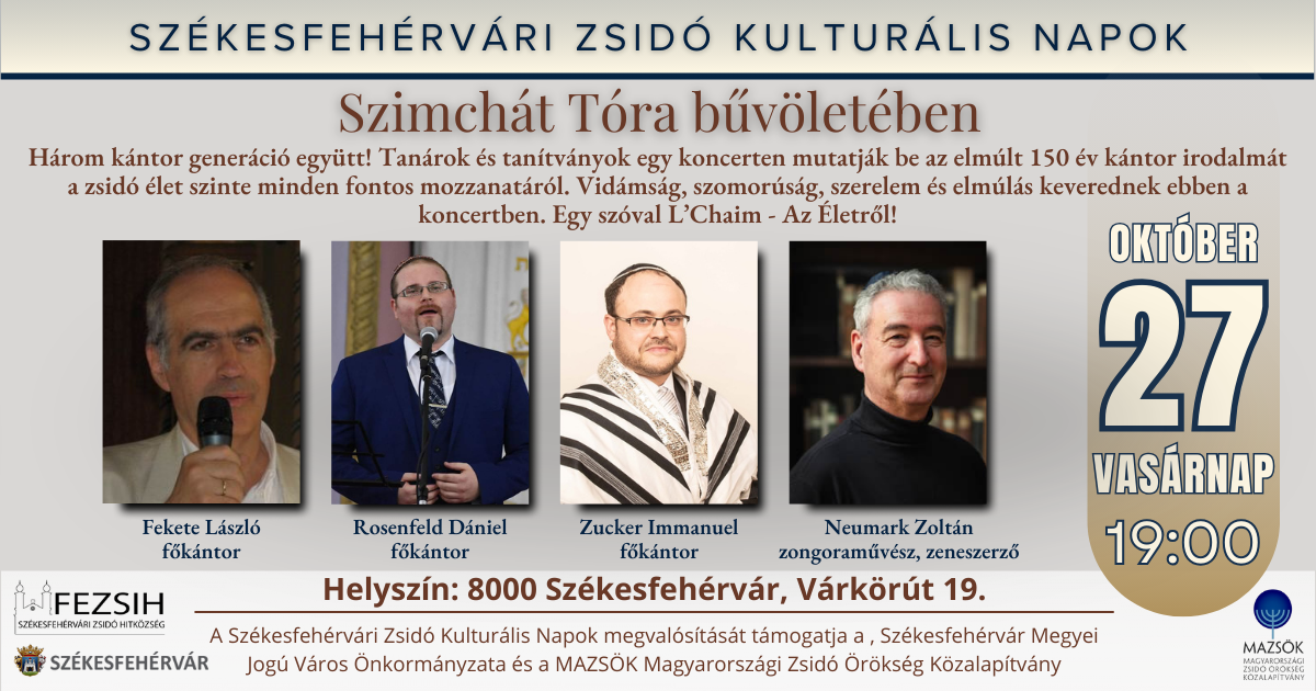 A Székesfehérvári Zsidó Kulturális Napok keretében 2024. október 27-én, vasárnap este 7 órakor tanárok és tanítványok különleges koncerten mutatják be az elmúlt 150 év kántor irodalmát a zsidó élet szinte minden fontos mozzanatáról. A koncert pontos helyszíne: Székesfehérvár, Várkörút 19. I. emelet.